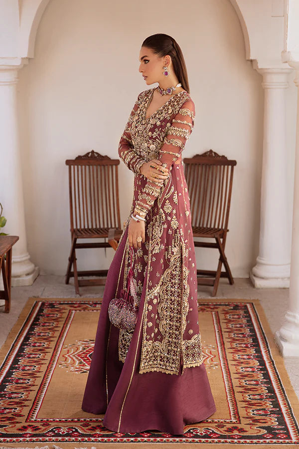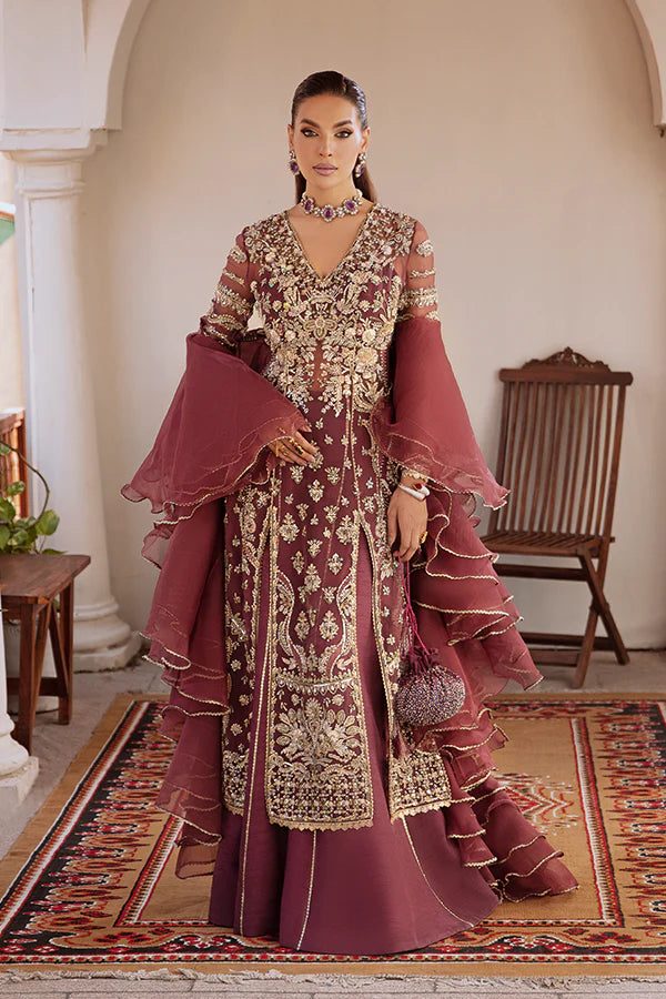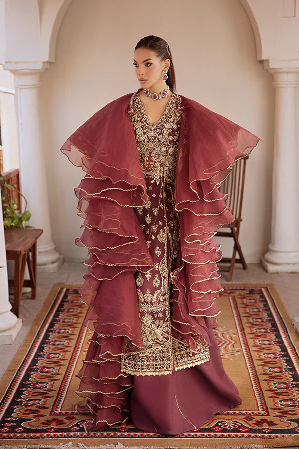 A rich maroon canvas serves as the backdrop for intricate embroidery work, which includes the delicate touch of dabka, gotta, sequin, pearls, and kiran. This opulent ensemble consists of an organza dupatta, an ethereal organza shirt, and a luxurious raw silk trouser.