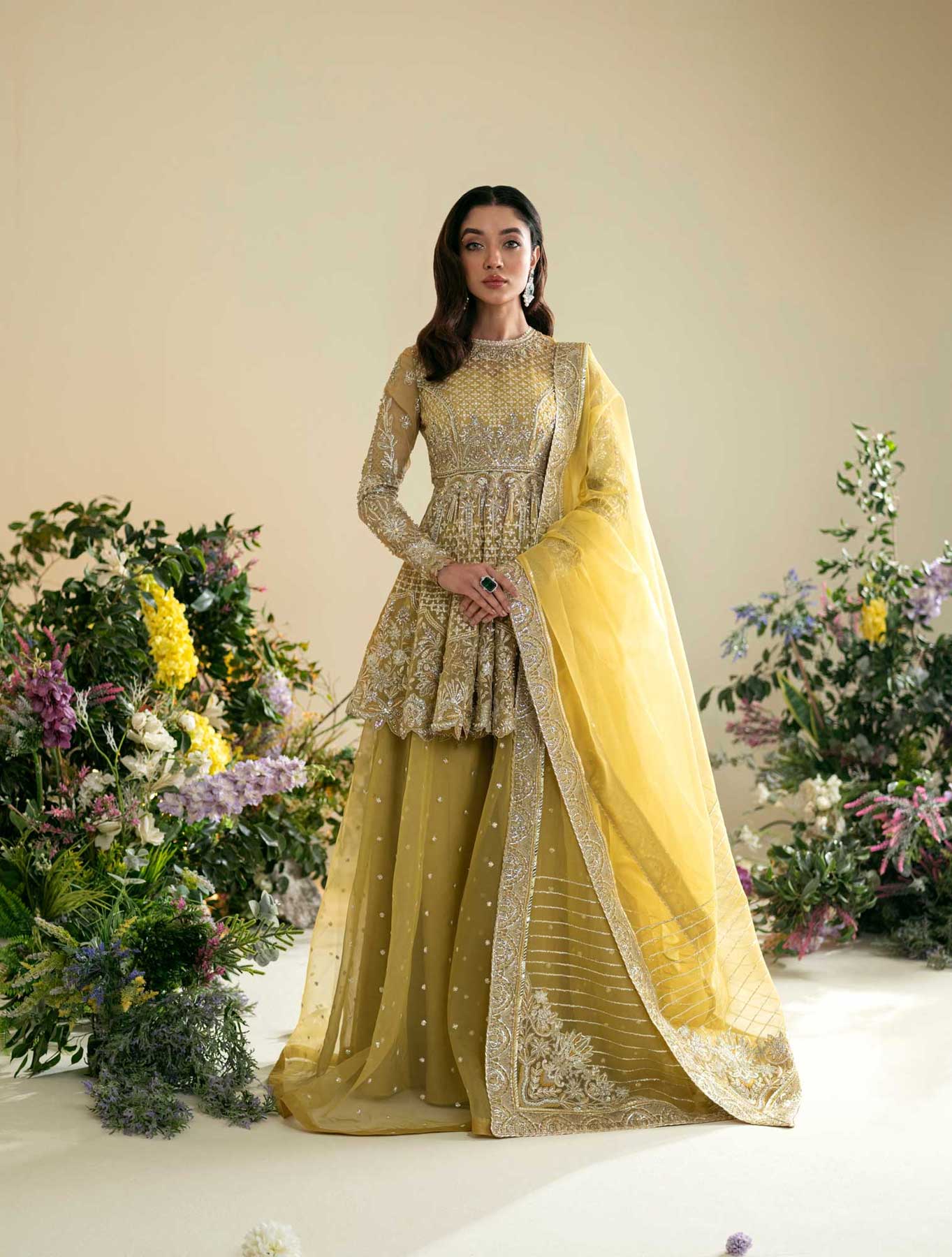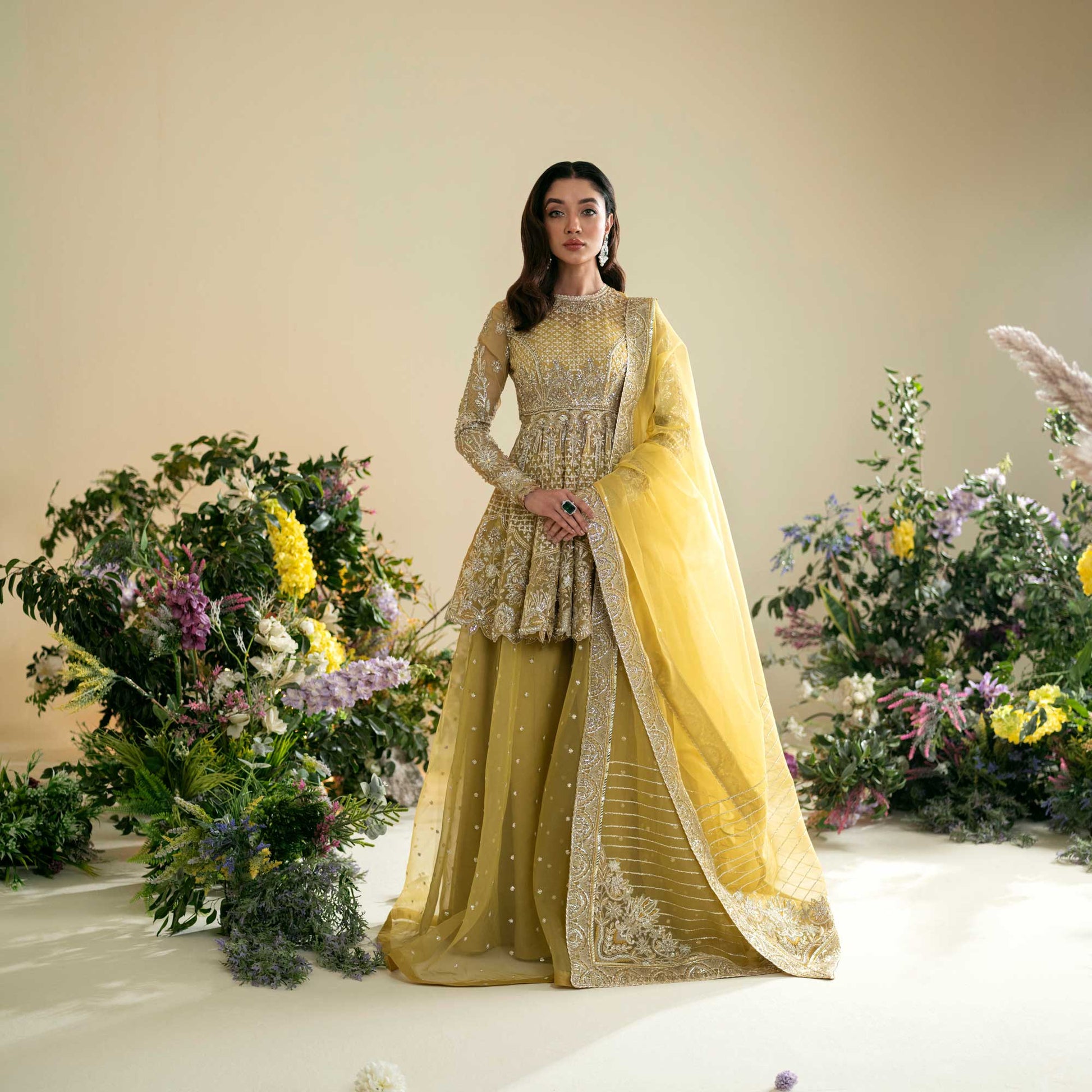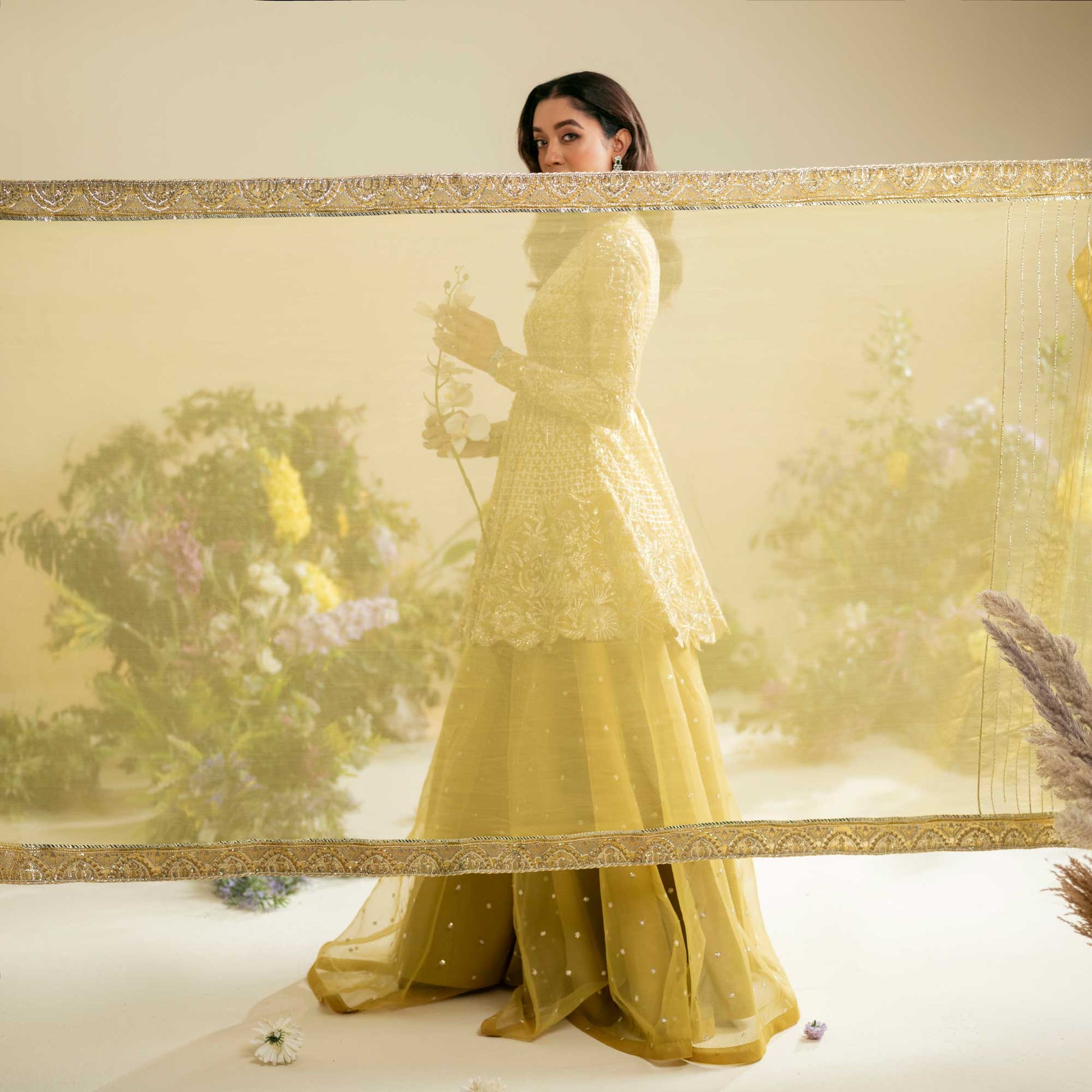 An organza shirt and sharara, adorned with intricate silver moti work and meticulous embroidery. The embellishments include luminous pearls, intricate dabka, sparkling stones, and ornate tilla, creating a harmonious blend that epitomizes grandeur. Enhanced with an organza dupatta, this ensemble becomes a true celebration of refined style, offering a regal and majestic presence for your most special occasions.