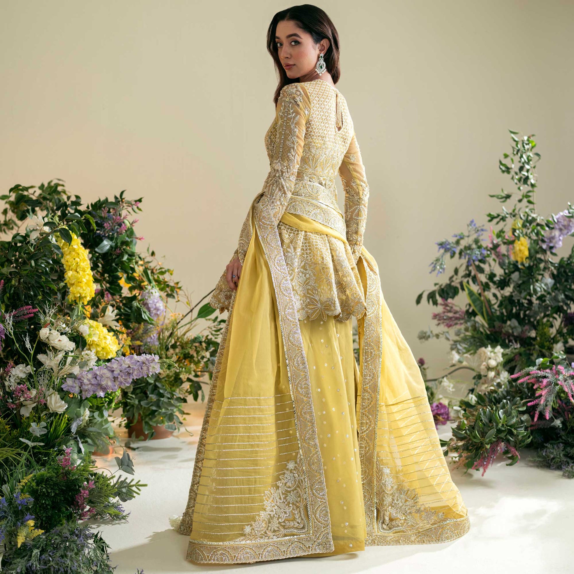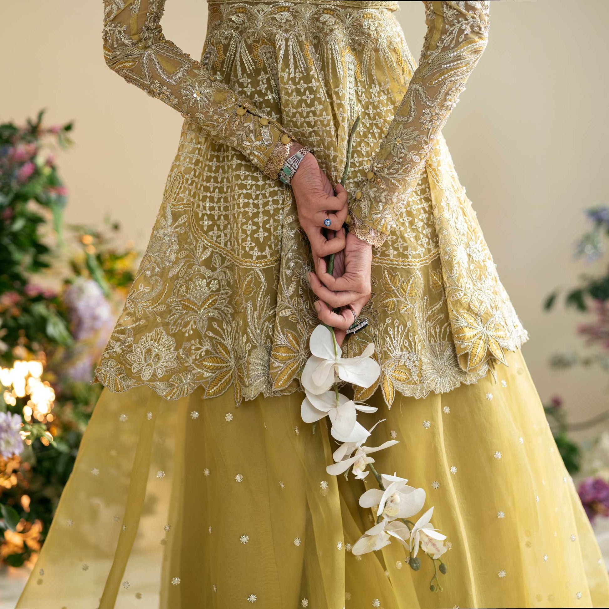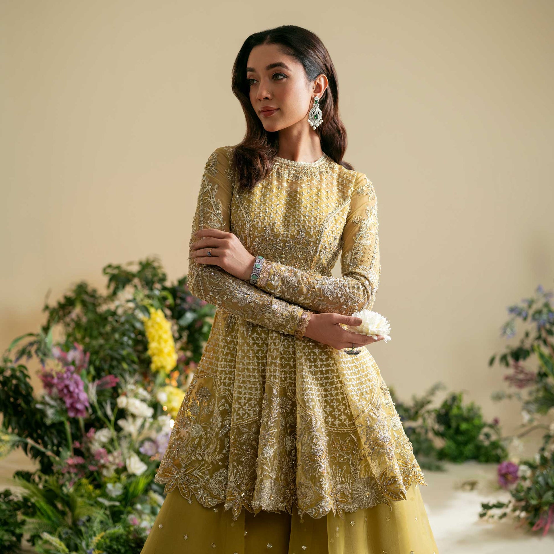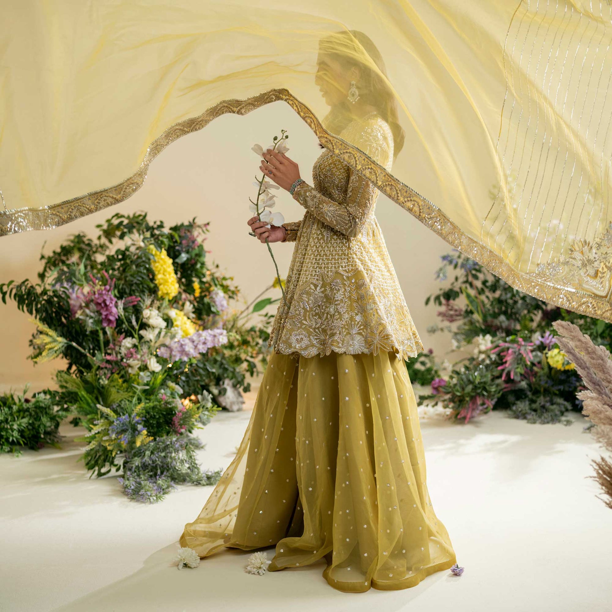 An organza shirt and sharara, adorned with intricate silver moti work and meticulous embroidery. The embellishments include luminous pearls, intricate dabka, sparkling stones, and ornate tilla, creating a harmonious blend that epitomizes grandeur. Enhanced with an organza dupatta, this ensemble becomes a true celebration of refined style, offering a regal and majestic presence for your most special occasions.