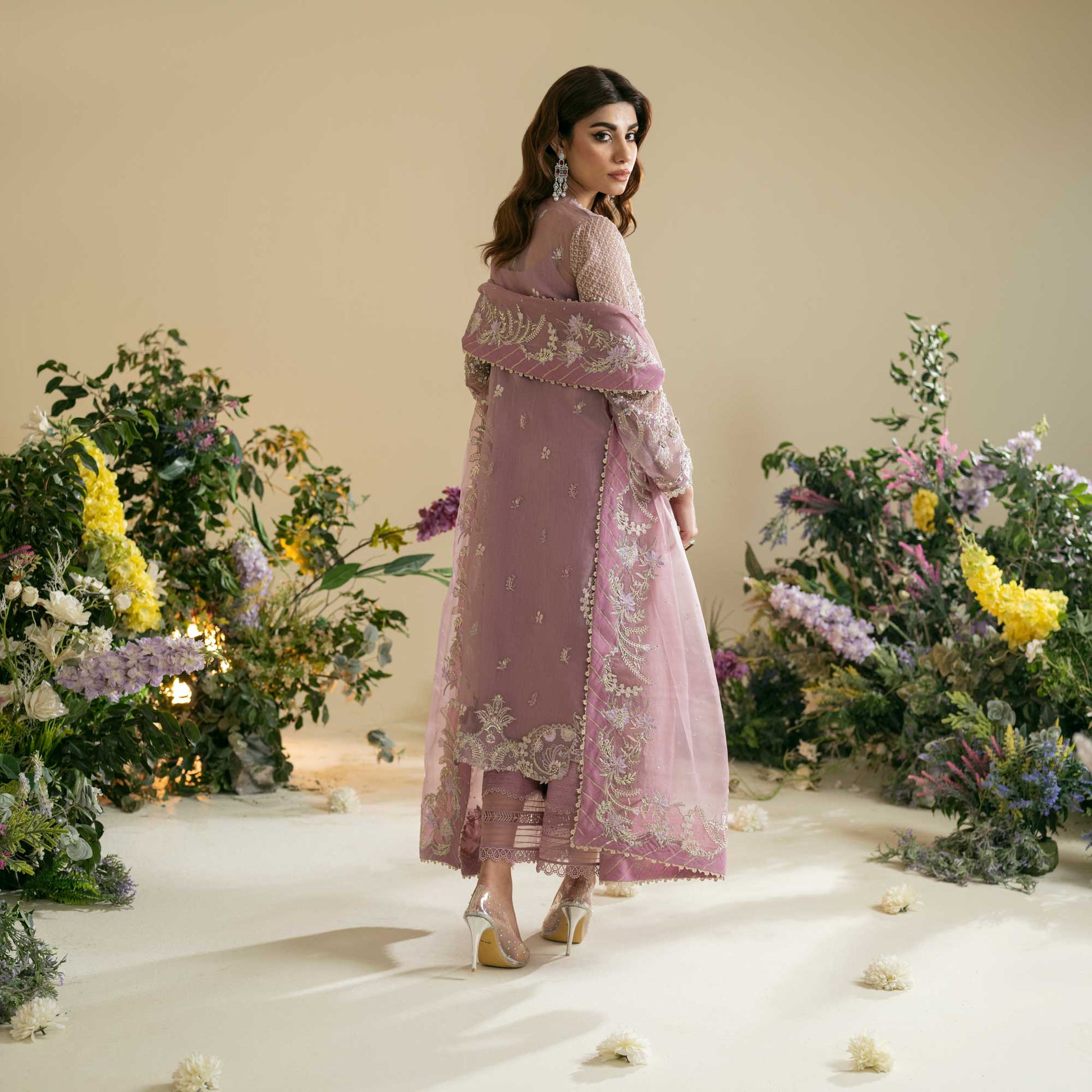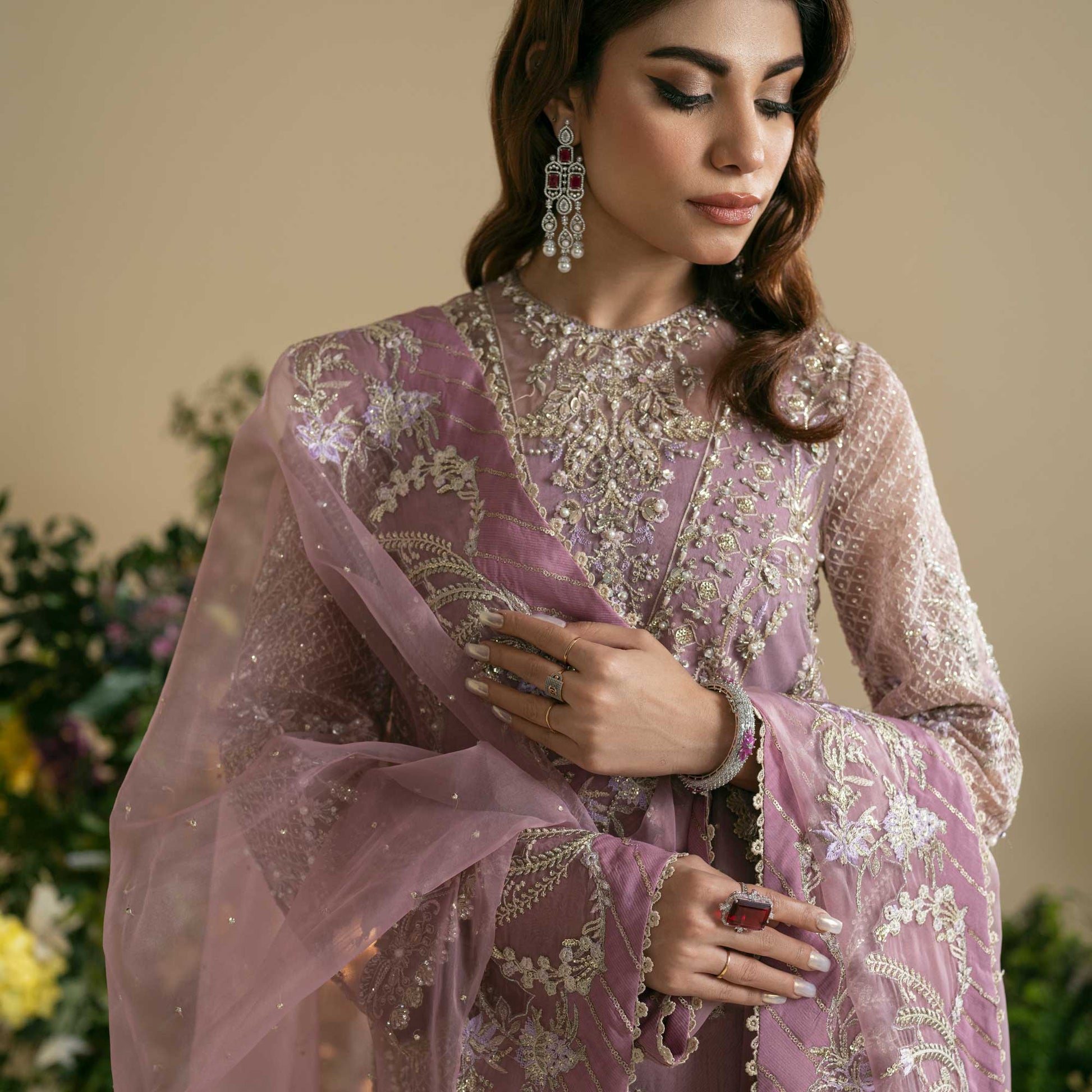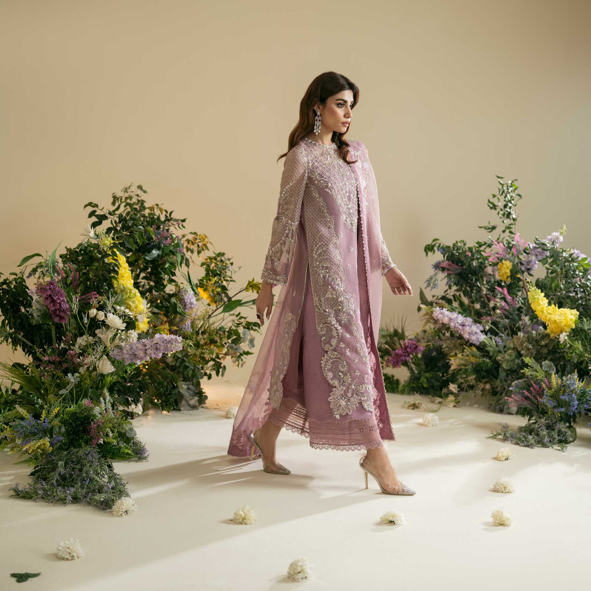 A harmony of light pink and lavender hues. The organza shirt and raw silk trousers are a canvas for exquisite embroidery, featuring a rich interplay of pearls, dabka, kiran, stones, Tilla, and meticulous thread work. This luxury formal ensemble is a testament to masterful craftsmanship, elevating your presence with every step. Draped in its celestial beauty, you embody the epitome of poise at any grand affair.
