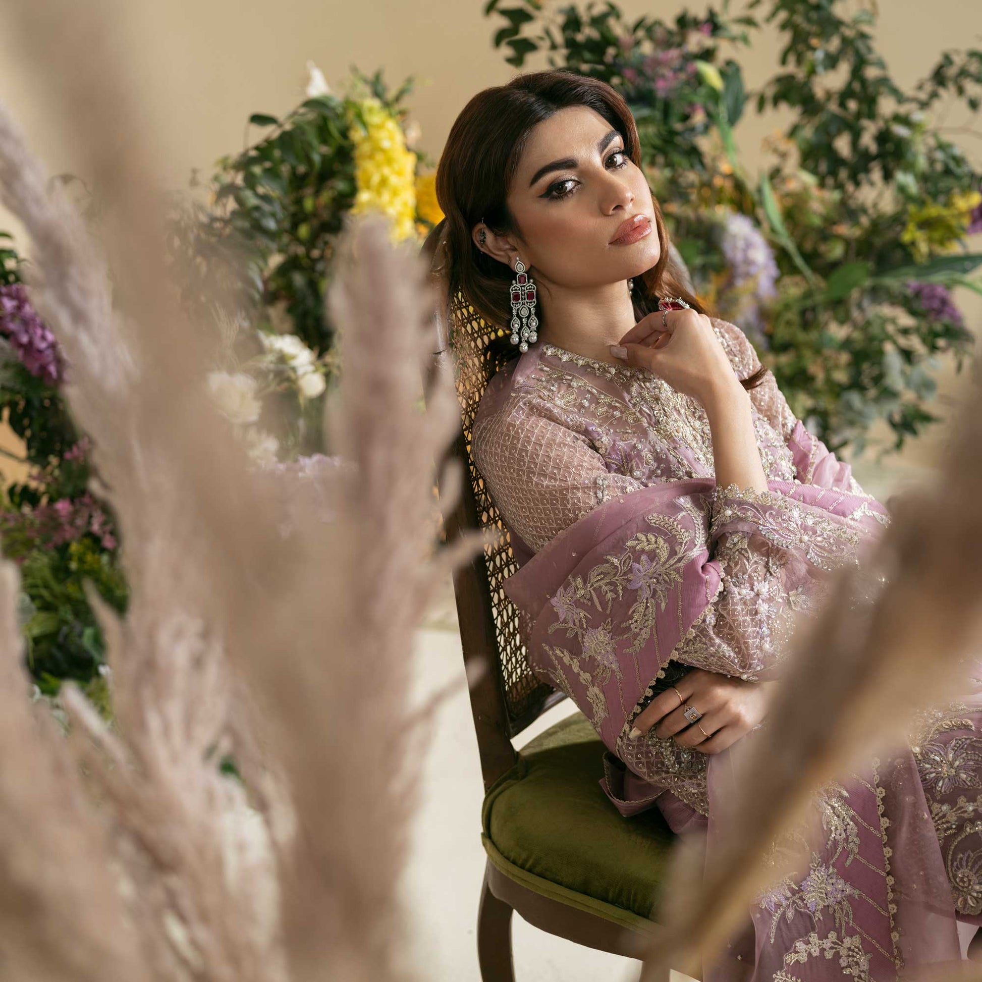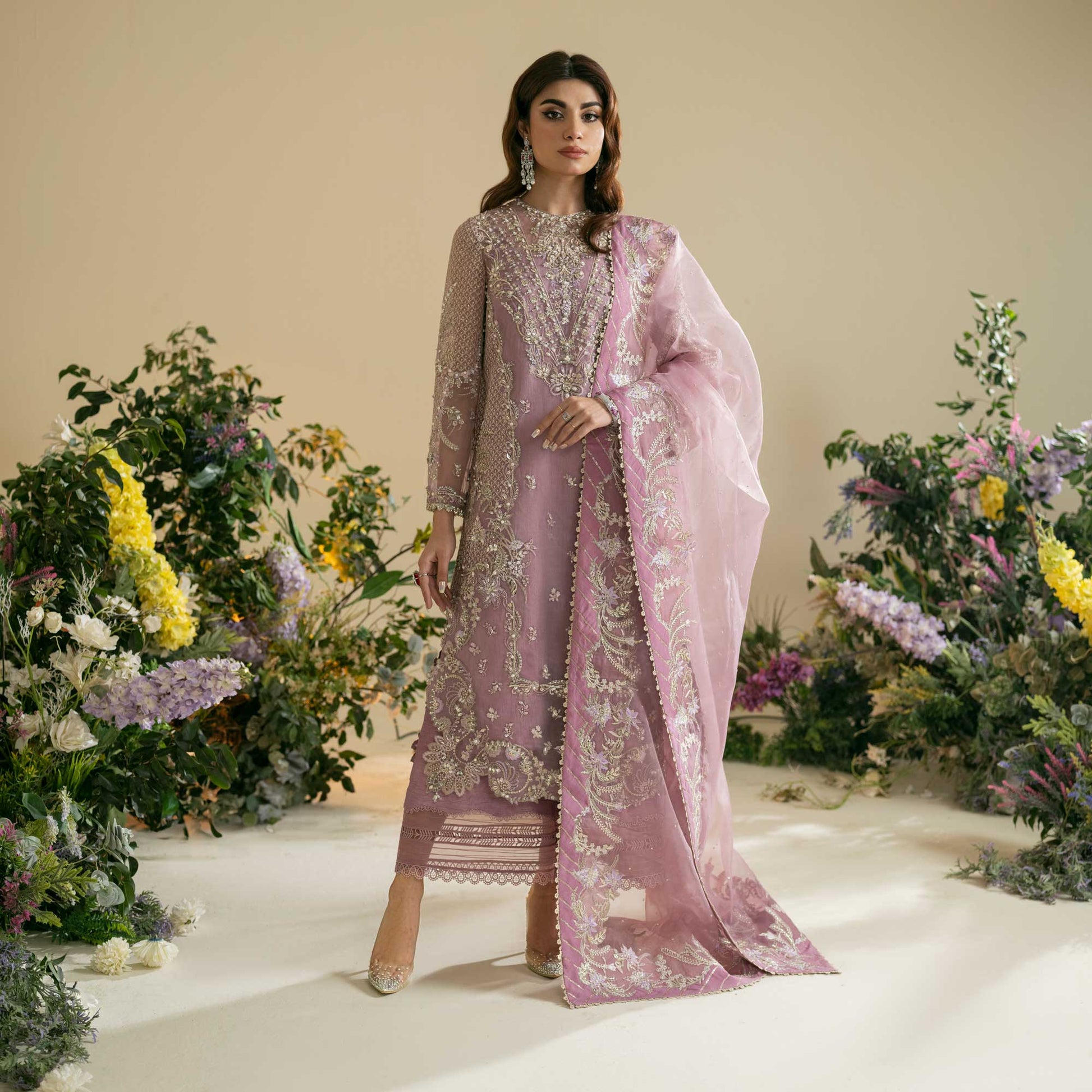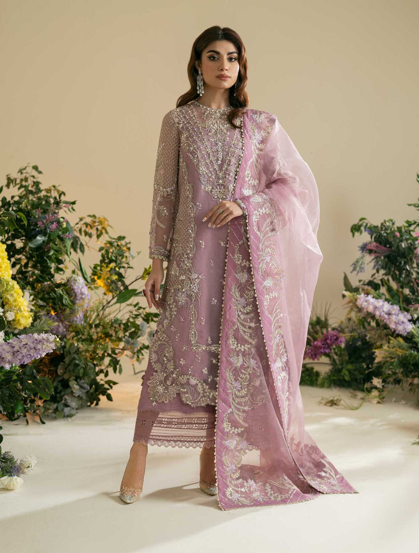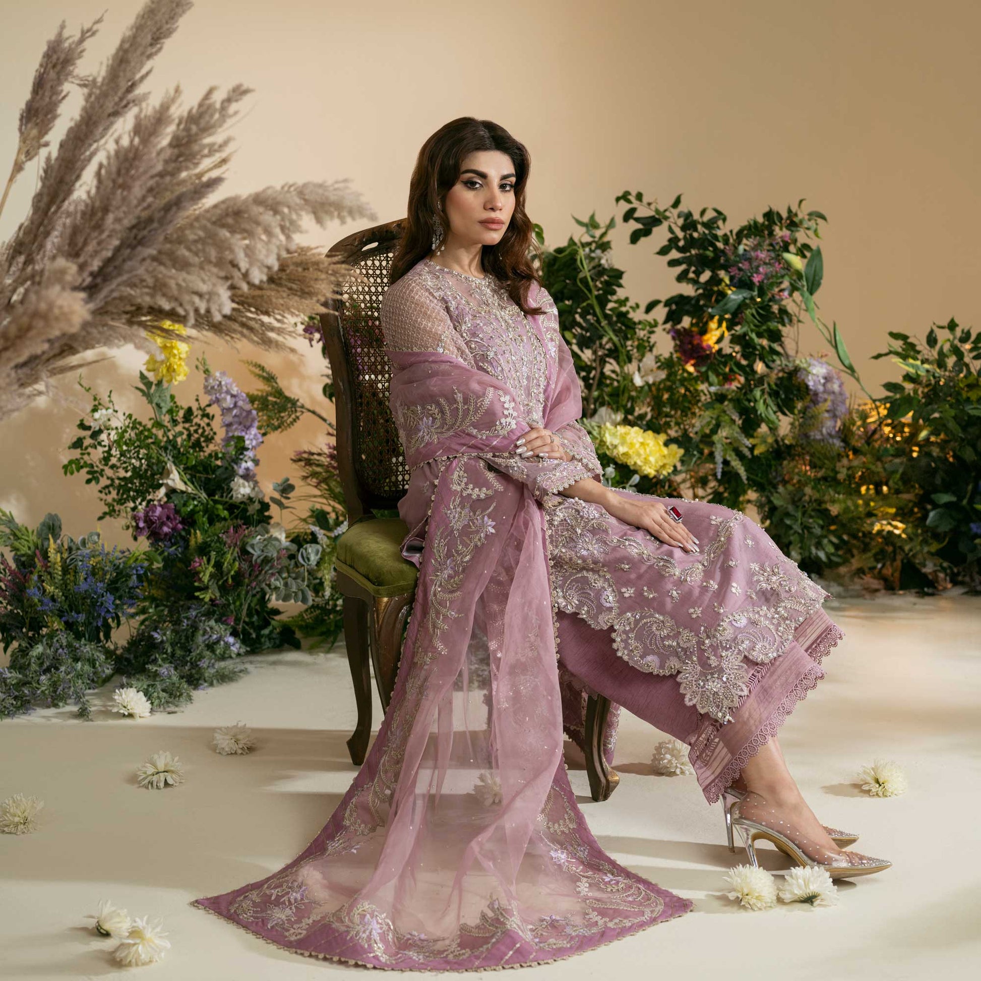 A harmony of light pink and lavender hues. The organza shirt and raw silk trousers are a canvas for exquisite embroidery, featuring a rich interplay of pearls, dabka, kiran, stones, Tilla, and meticulous thread work. This luxury formal ensemble is a testament to masterful craftsmanship, elevating your presence with every step. Draped in its celestial beauty, you embody the epitome of poise at any grand affair.