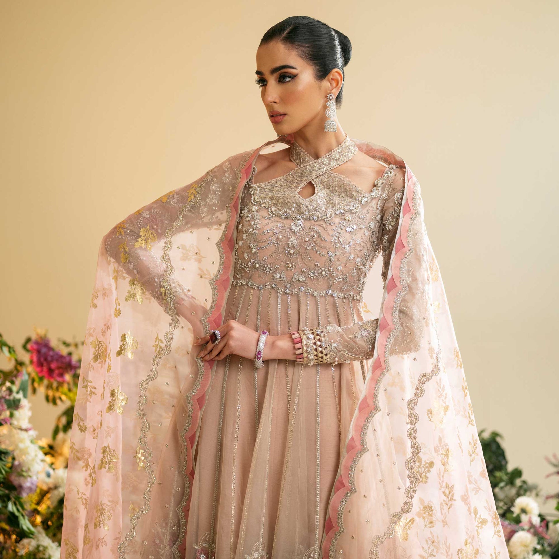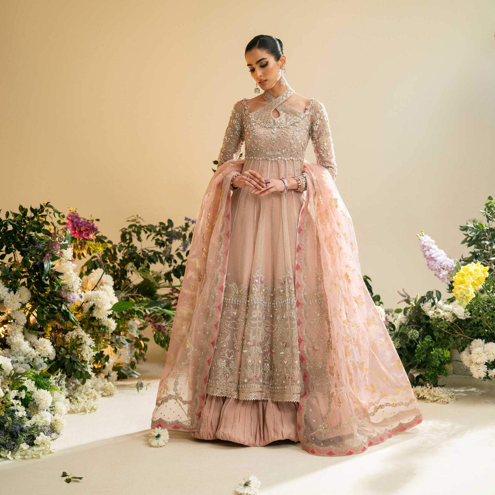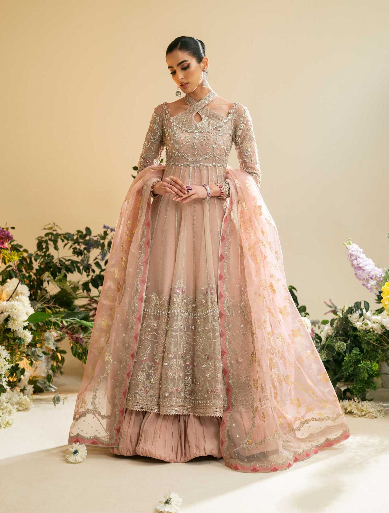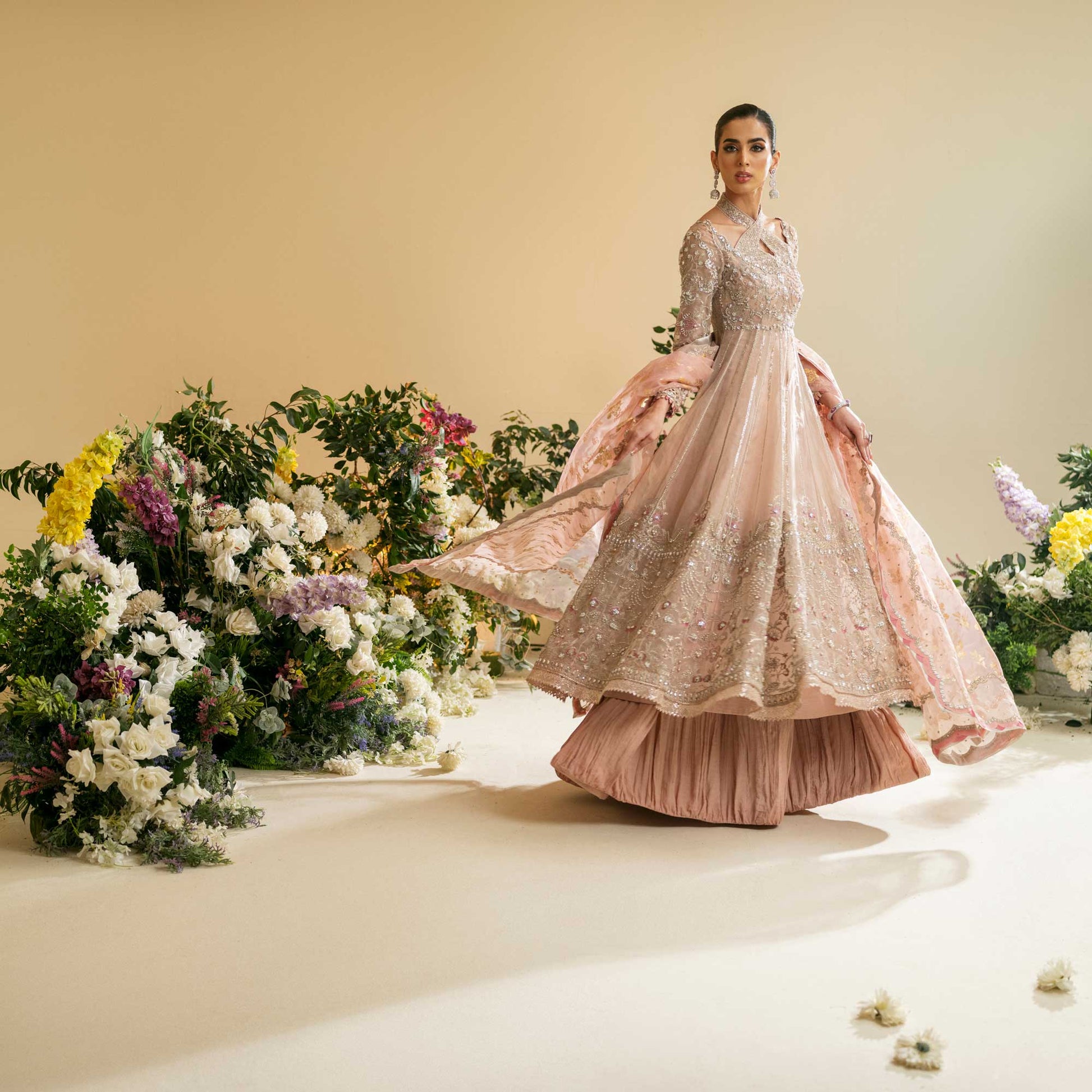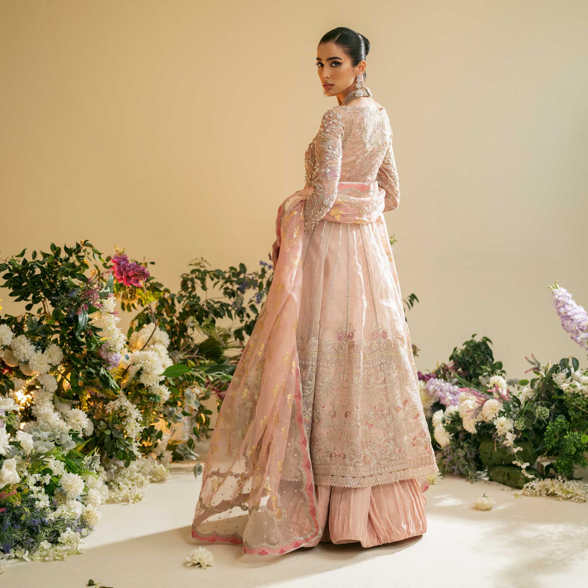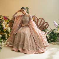 Zunia is a lavishly curated lavender ensemble that exudes refined elegance. The organza shirt with beautiful harmonized needlework, paired flawlessly with crushed trousers in raw silk, showcases meticulous craftsmanship adorned with pearls, dabka, kiran, tilla, and exquisite threadwork. Elevate your formal aesthetic with the ethereal allure of Zunia, where breathtaking embroidery meets the richness of lavender tones, guaranteeing you a standout presence on your most treasured occasions.