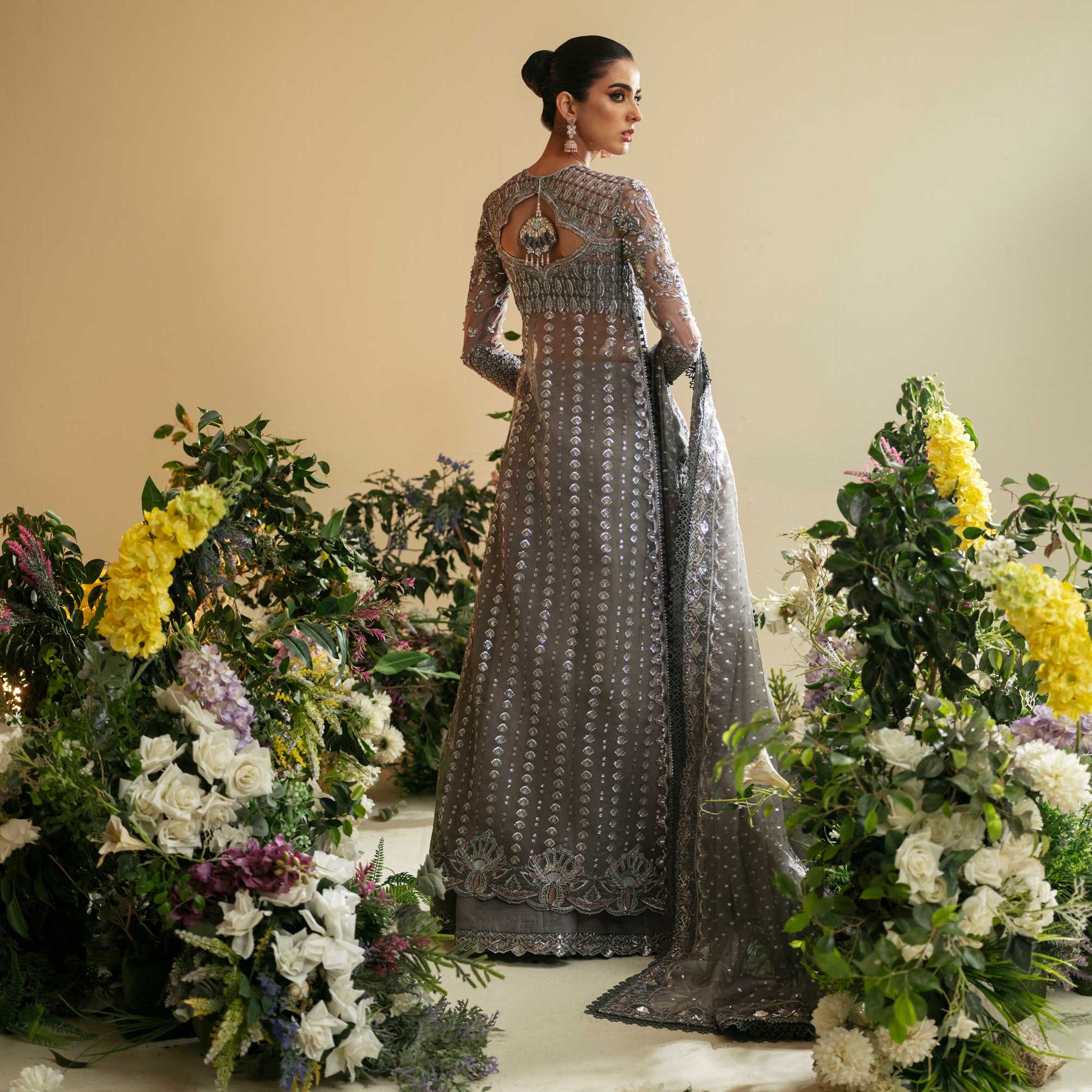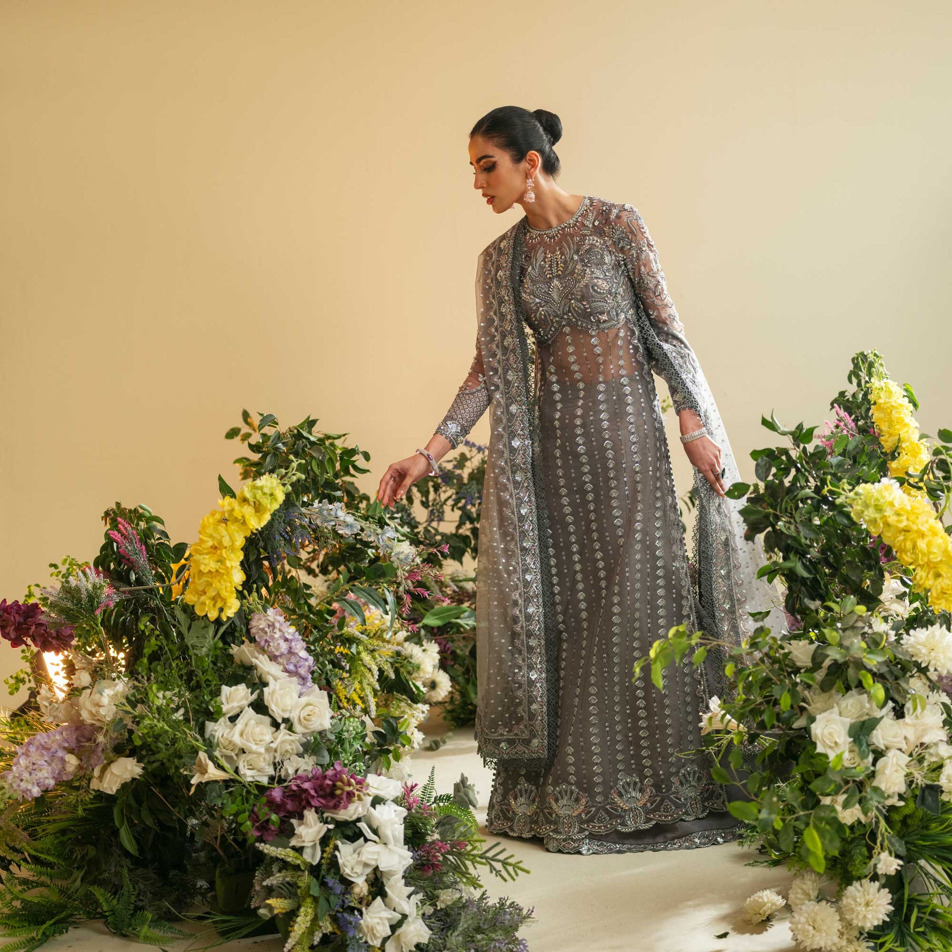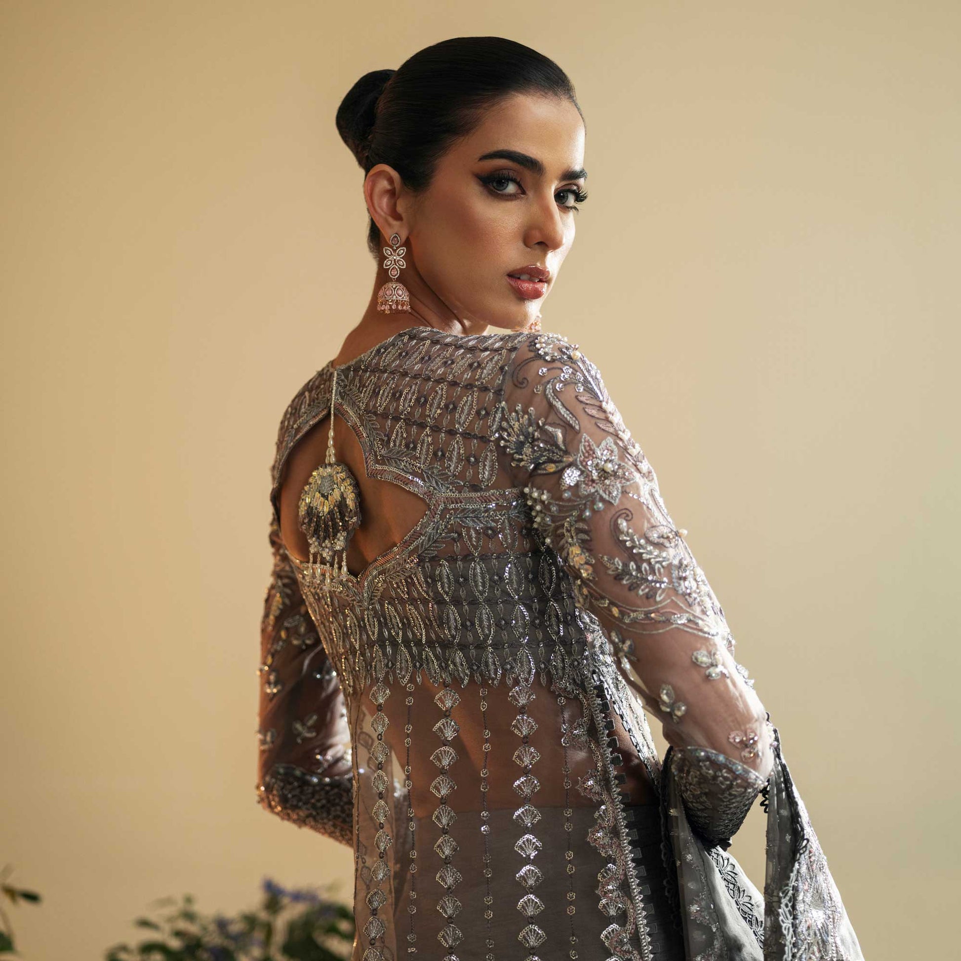 Shayna, a fascinating masterpiece from Nyra's luxury collection in captivating shades of grey and black. The organza shirt features a mesmerizing back neck design adorned with pearls and stones enhanced with an intricate masterwork. Paired with raw silk trousers and complemented by an ethereal organza dupatta, this heirloom piece from the renowned collection seamlessly merges elegance with opulence.