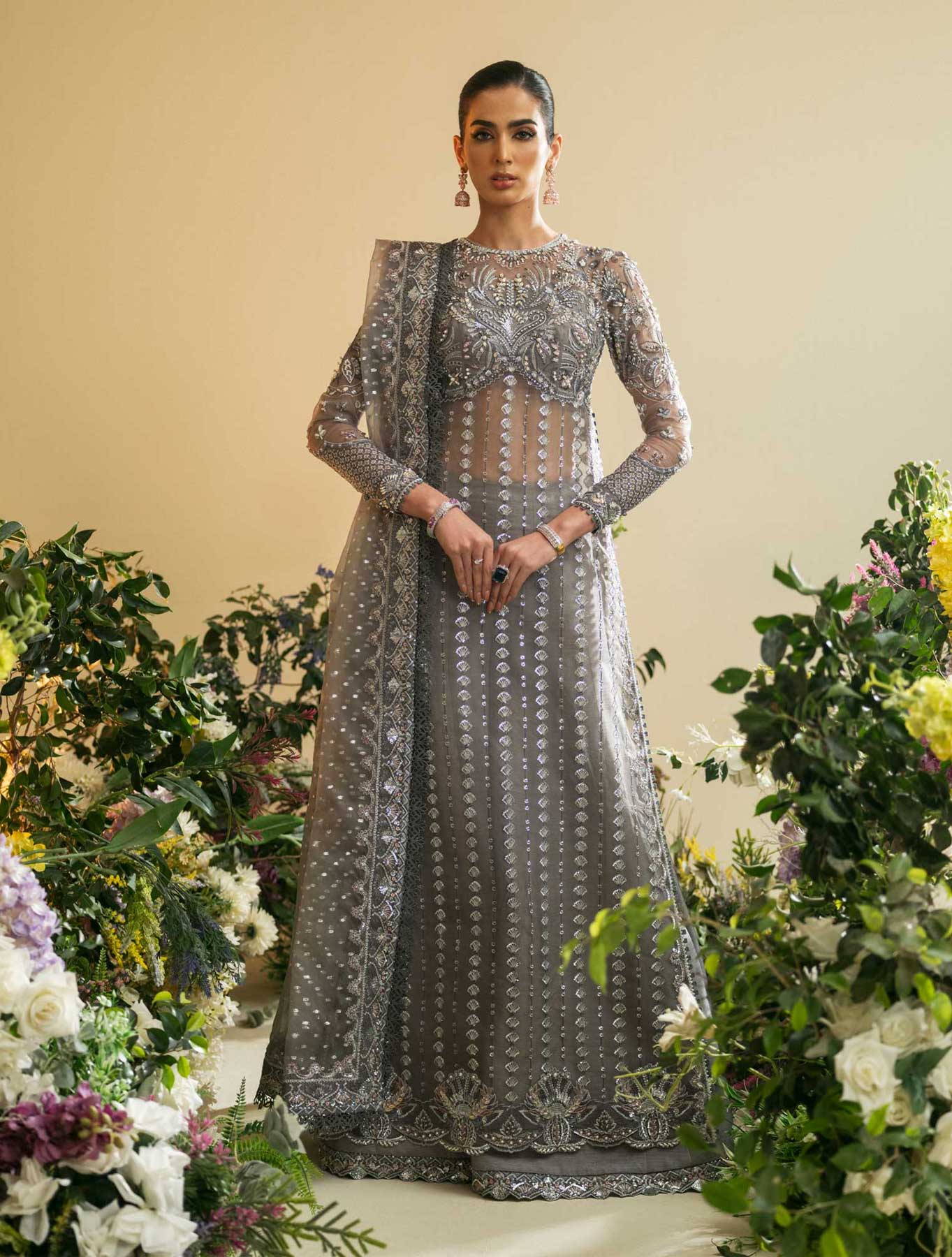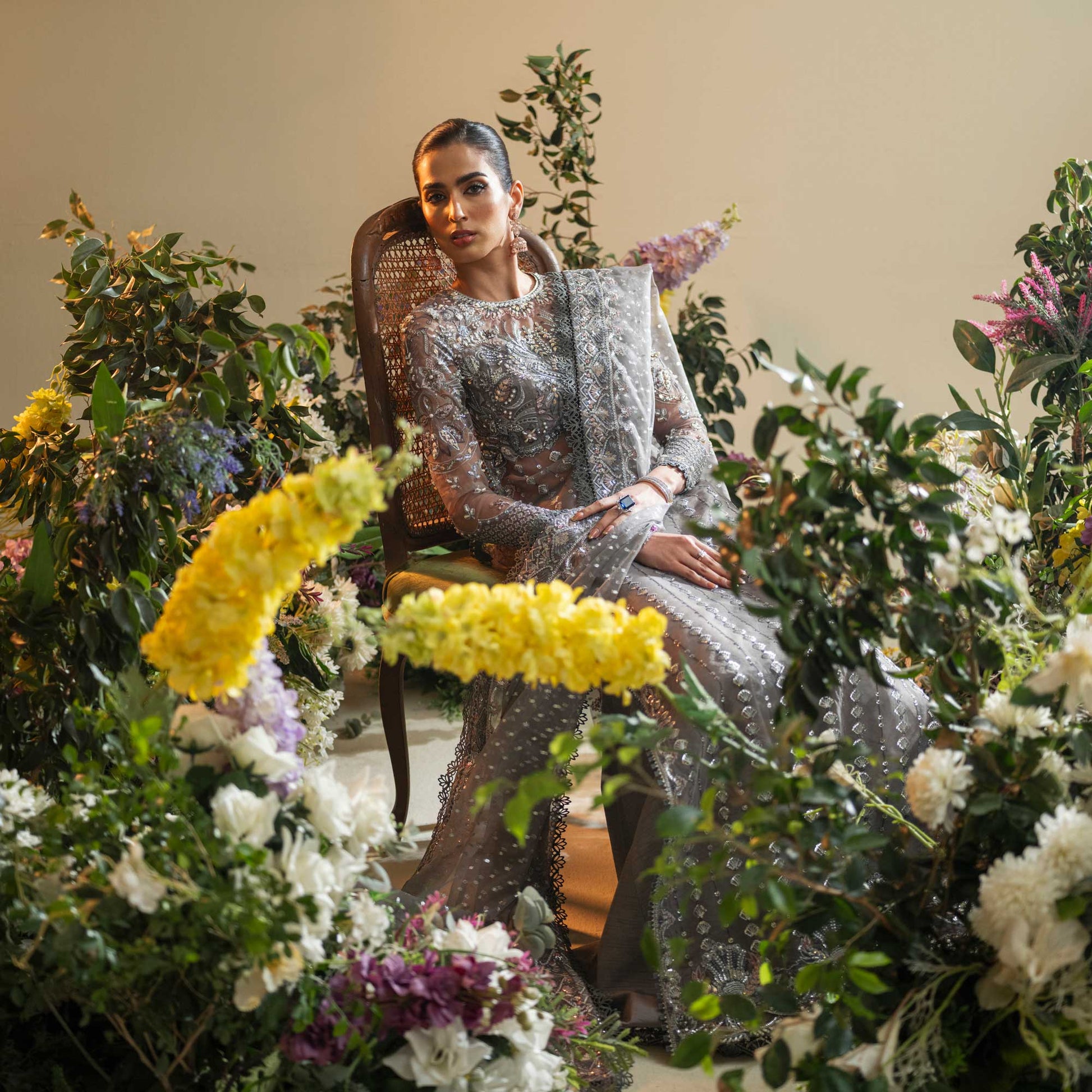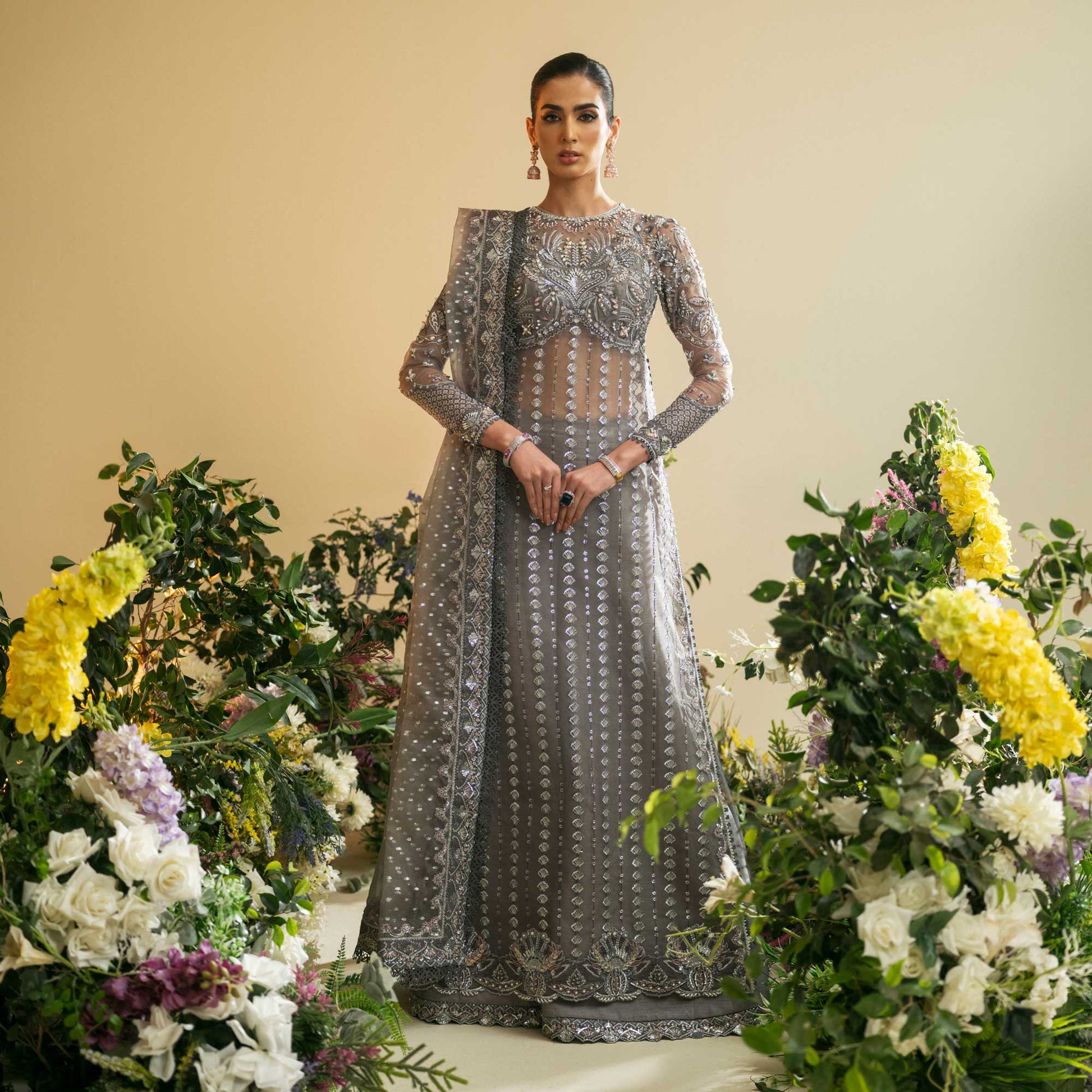 Shayna, a fascinating masterpiece from Nyra's luxury collection in captivating shades of grey and black. The organza shirt features a mesmerizing back neck design adorned with pearls and stones enhanced with an intricate masterwork. Paired with raw silk trousers and complemented by an ethereal organza dupatta, this heirloom piece from the renowned collection seamlessly merges elegance with opulence.