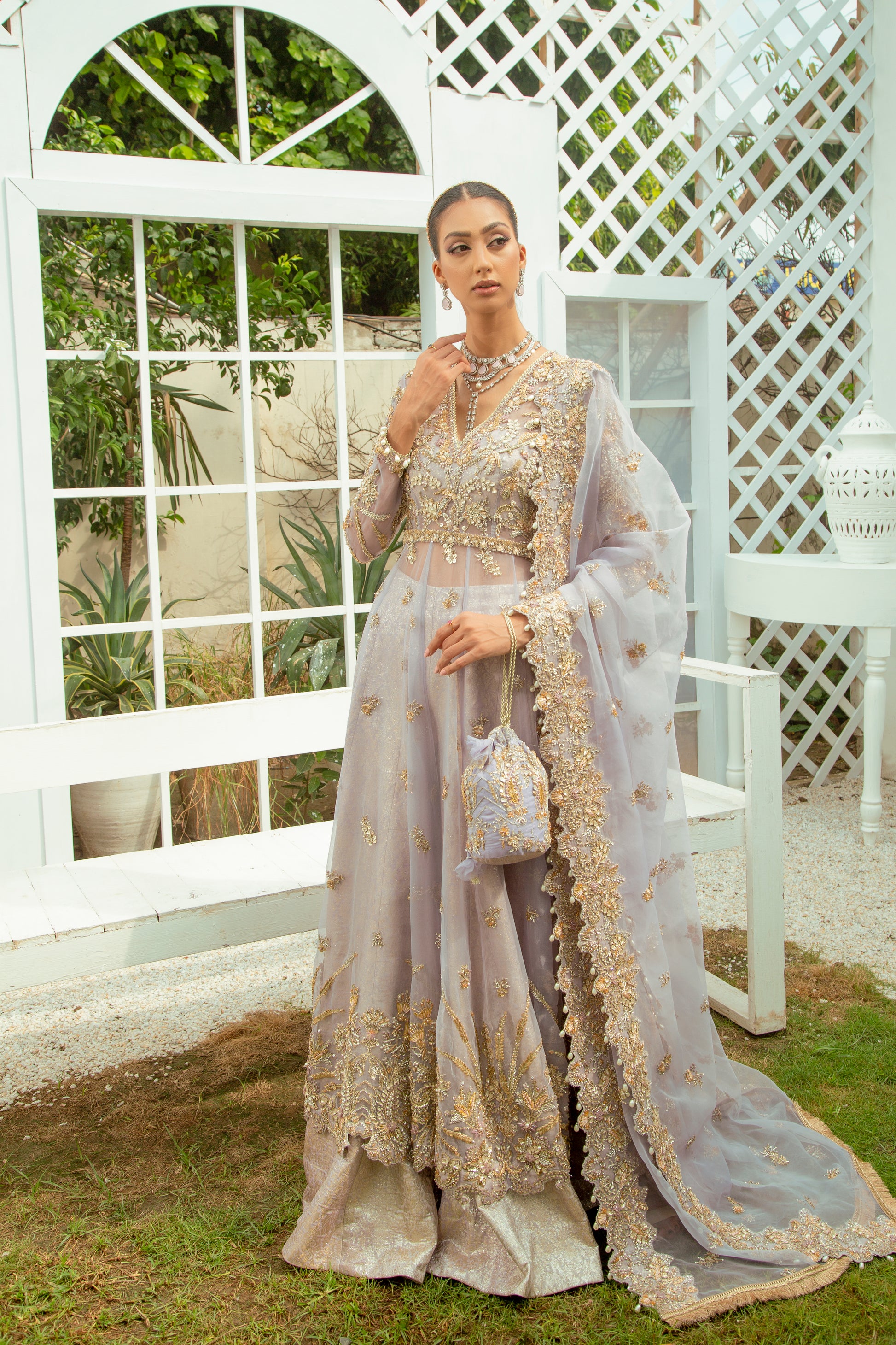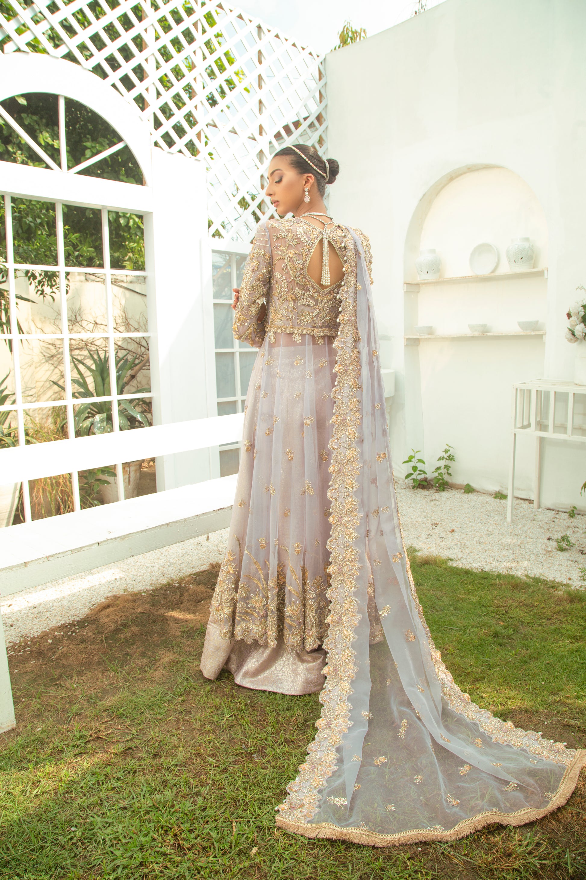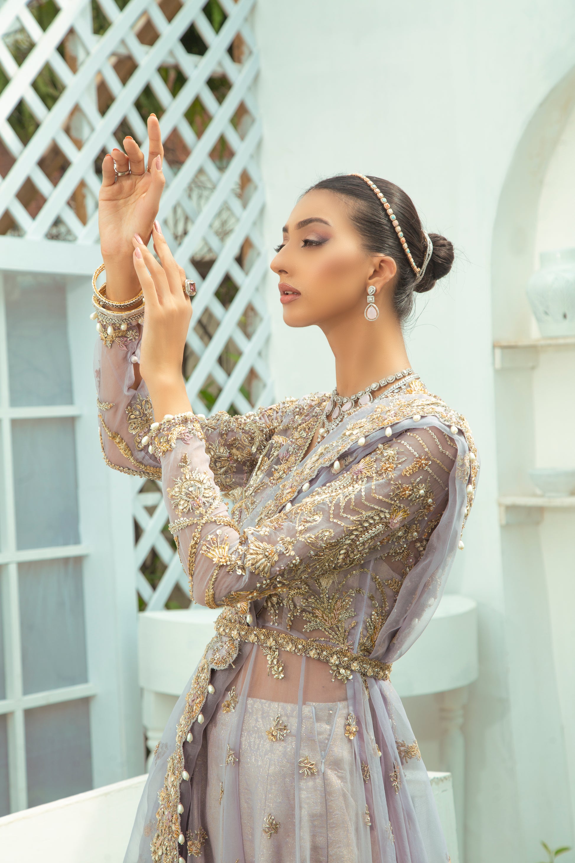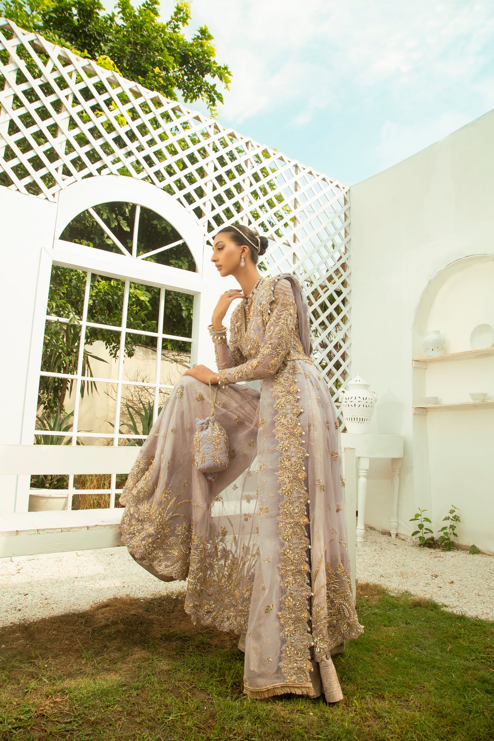 An alluring lilac colored pishwas dress with a florid composition. A heavy work of gold sequin and rose gold petals, put-together with sharara pants. The look is finished with an organza duppata comprising of heavy borders with the same sequin and petal work