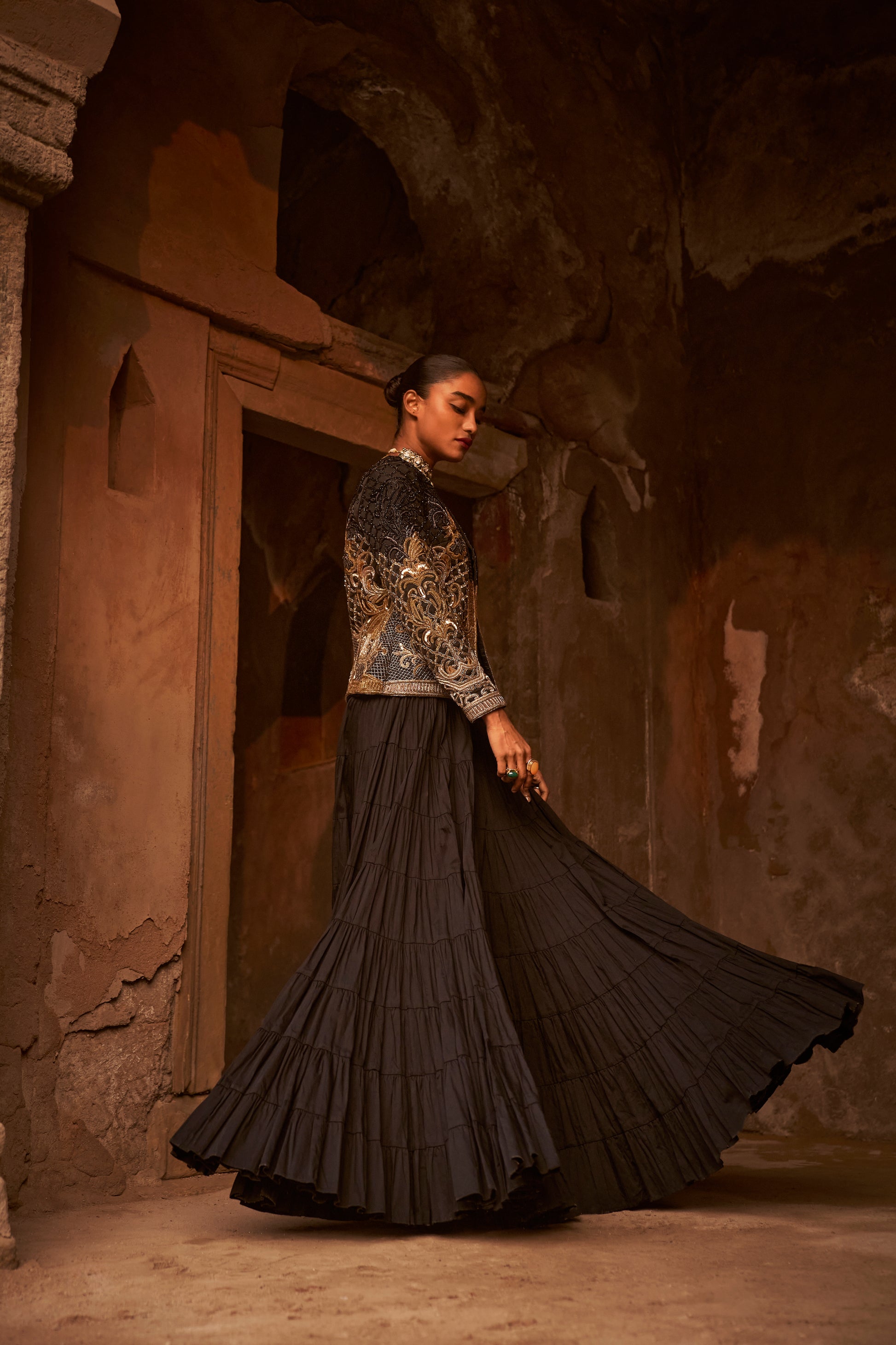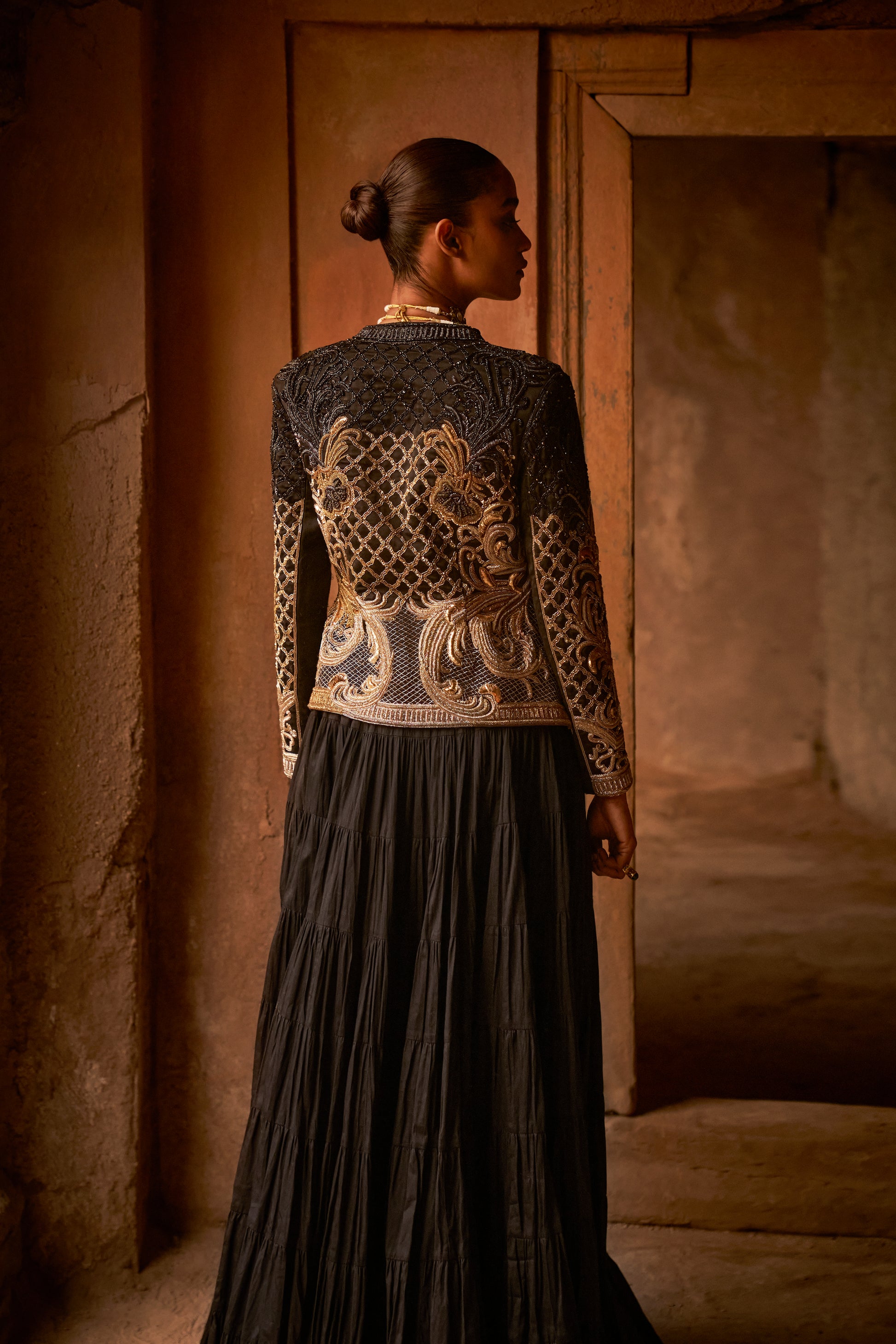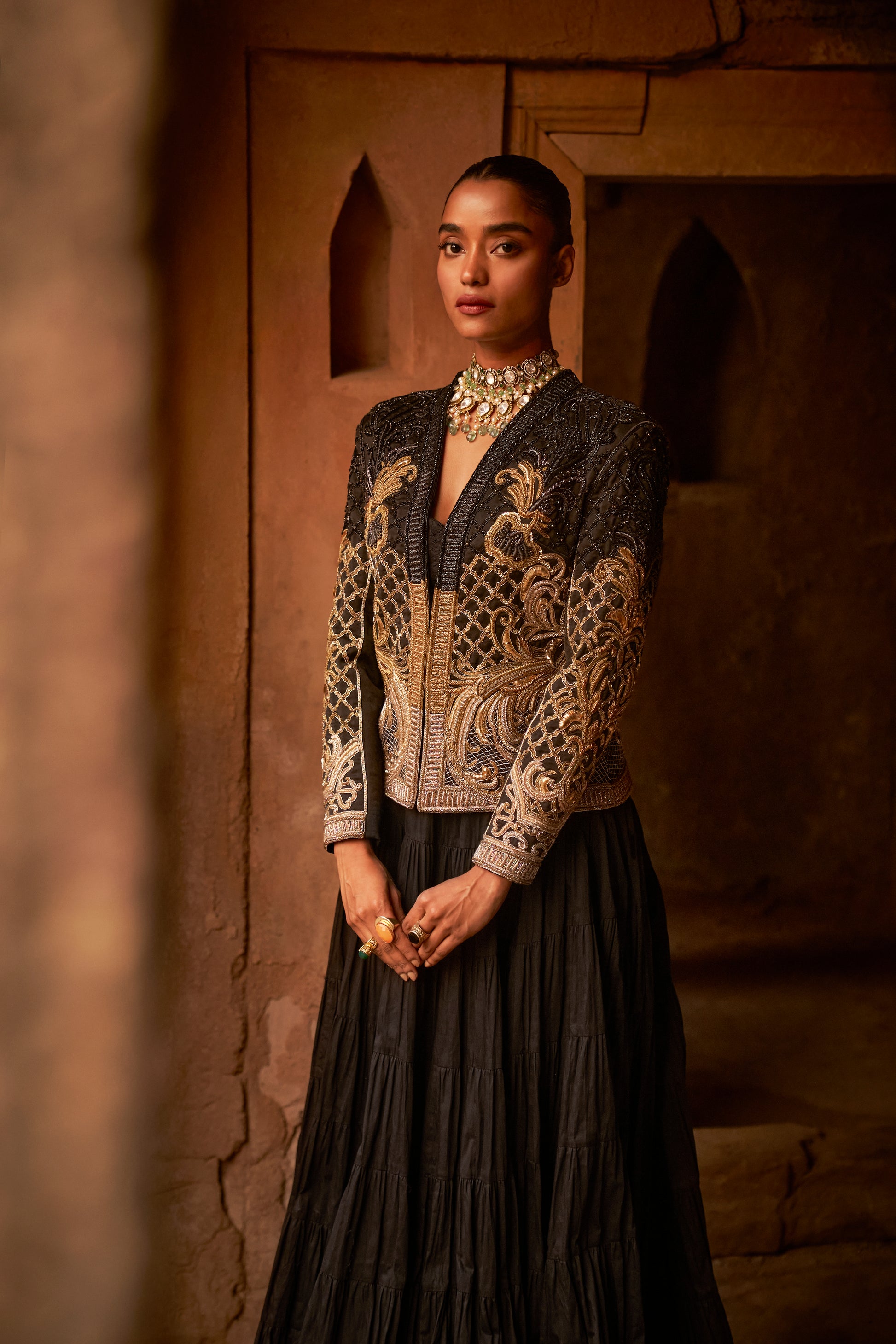 Blazer: Golden lurex blazer, full sleeves, single hook blazer, golden zari dabka Zardozi heavy embellished work