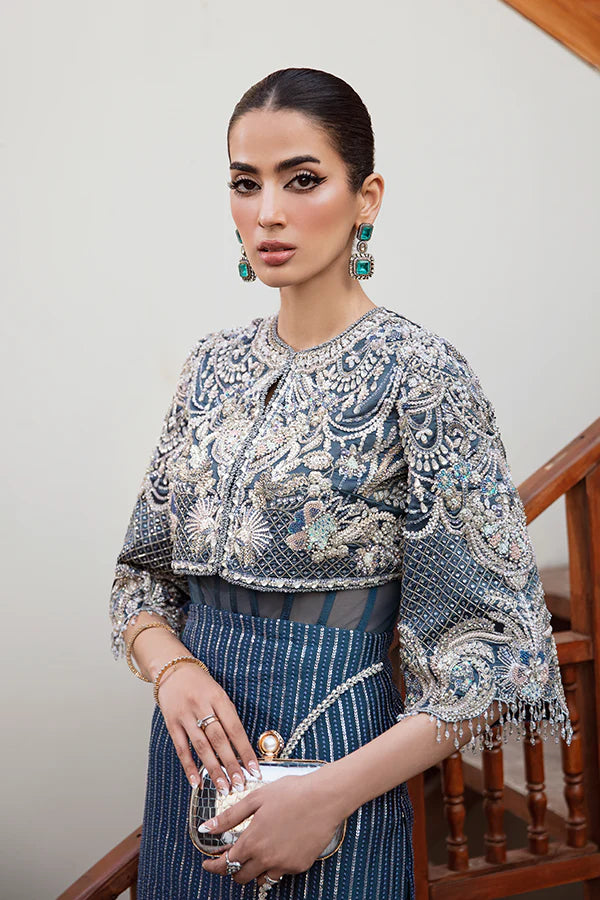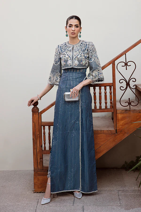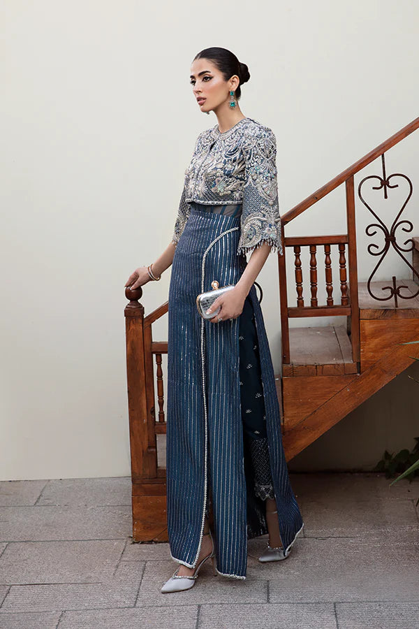 a stunning gem that's destined to leave you awestruck. Its enchanting blue hue sets the stage for a truly unique masterpiece. Silk trousers and a jacket are adorned with opulent golden embroidery, boasting intricate florals, delicate sequins, and a rich tapestry of dabka, gotta, and cutdana. But what truly makes Zeev stand out is the meticulous kiran work, elevating it to an emblem of elegance and allure. This ensemble is an invitation to unforgettable moments where you steal the spotlight with grace and style.